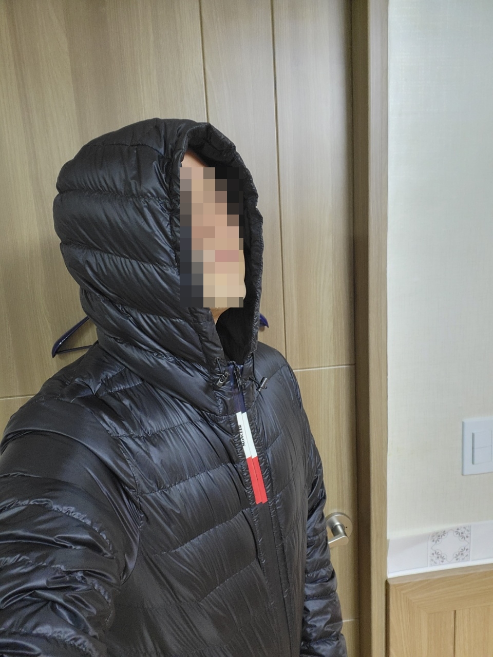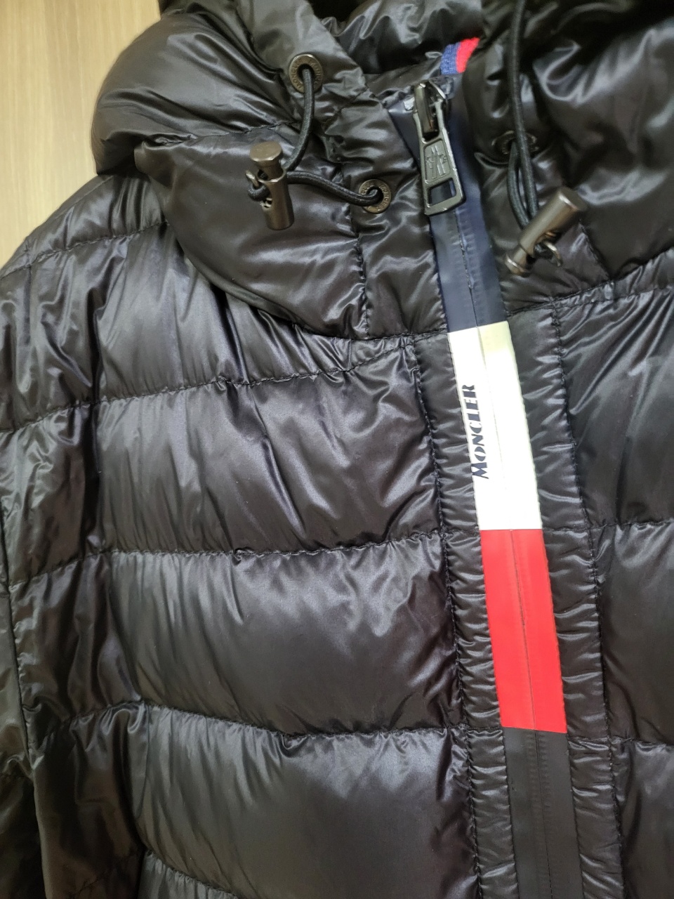 제가 몽클 Rook Giubbotto 를 선택한 이유는 바로 아래 사진에서 볼 수 있듯이, 명치부터 시작해 지퍼를 올리는 턱 밑 까지 꽉 차있는, 프랑스 국기 스타일의 이 포인트 였습니다. 너무 무난한 왼팔에 있는 몽클레어 패치 하나만으론 좀 식상하고.