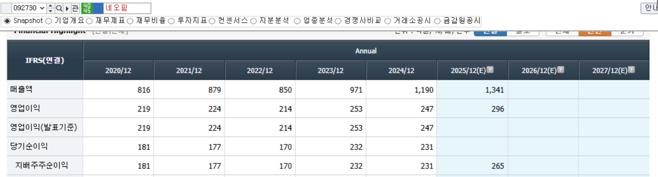 Fnguide 에서는 2025년 네오팜 의 예상 실적을 1341억 / 265억 을 예상을 하고 있다.
