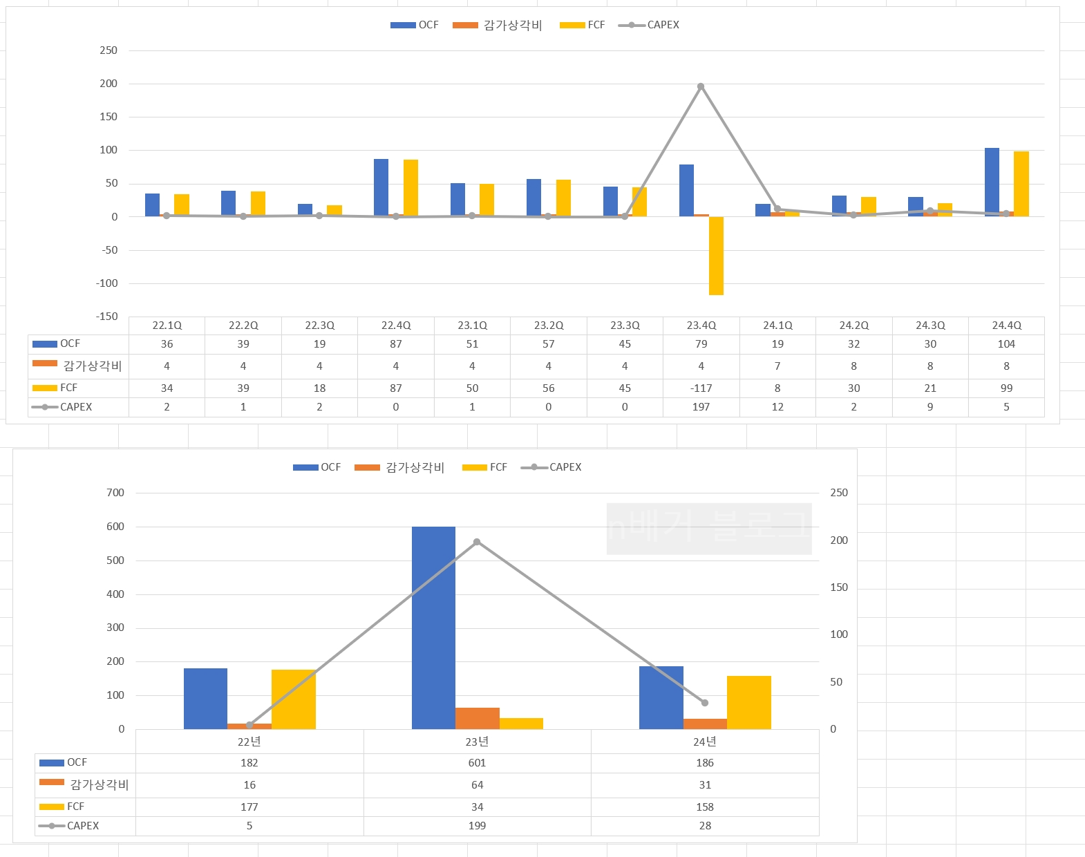이는 매출성장에도 불구하고 비용 증가폭이 커서 수익성을 다 훼손한것. CAPEX 가 큰 폭으로 감소 함녀서 OCF 감소에도 불구하고 FCF는 그래도 36억에서 157억으로 크게 개선되었다.