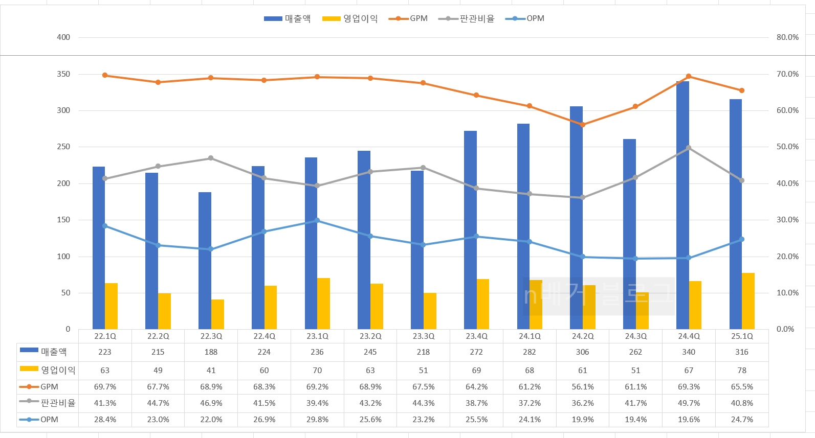 - 매출액증가: 네오팜 2025년 1분기 매출액은 yoy로 12% 증가한 316억.