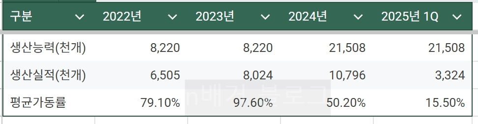 1개 분기별 생산량으로 보면 2025년 1Q 가 생산량이 가장 양호한 것이며, x 4를 하면 13,000 개로 YoY 약 23% 성장하는 생산량을 유추해 볼 수 있겠다.