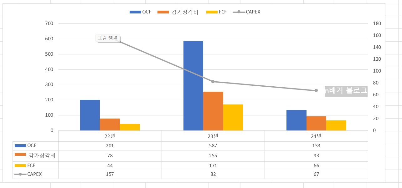 - OCF 또한 253억에서 133억으로 크게 감소함.