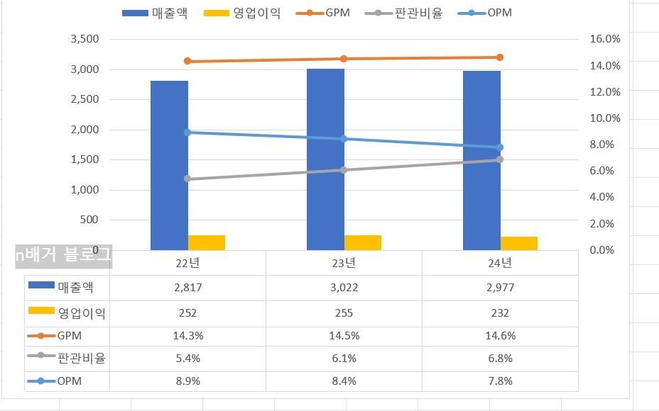 - 영업이익률 또한 3년 연속 하락 (8.94% → 8.44% → 7.79%) 했는데, 이는 매출총이익률이 소폭 개선되었음에도 판관비가 매출액 대비 꾸준히 증가한 영향이 컸다.