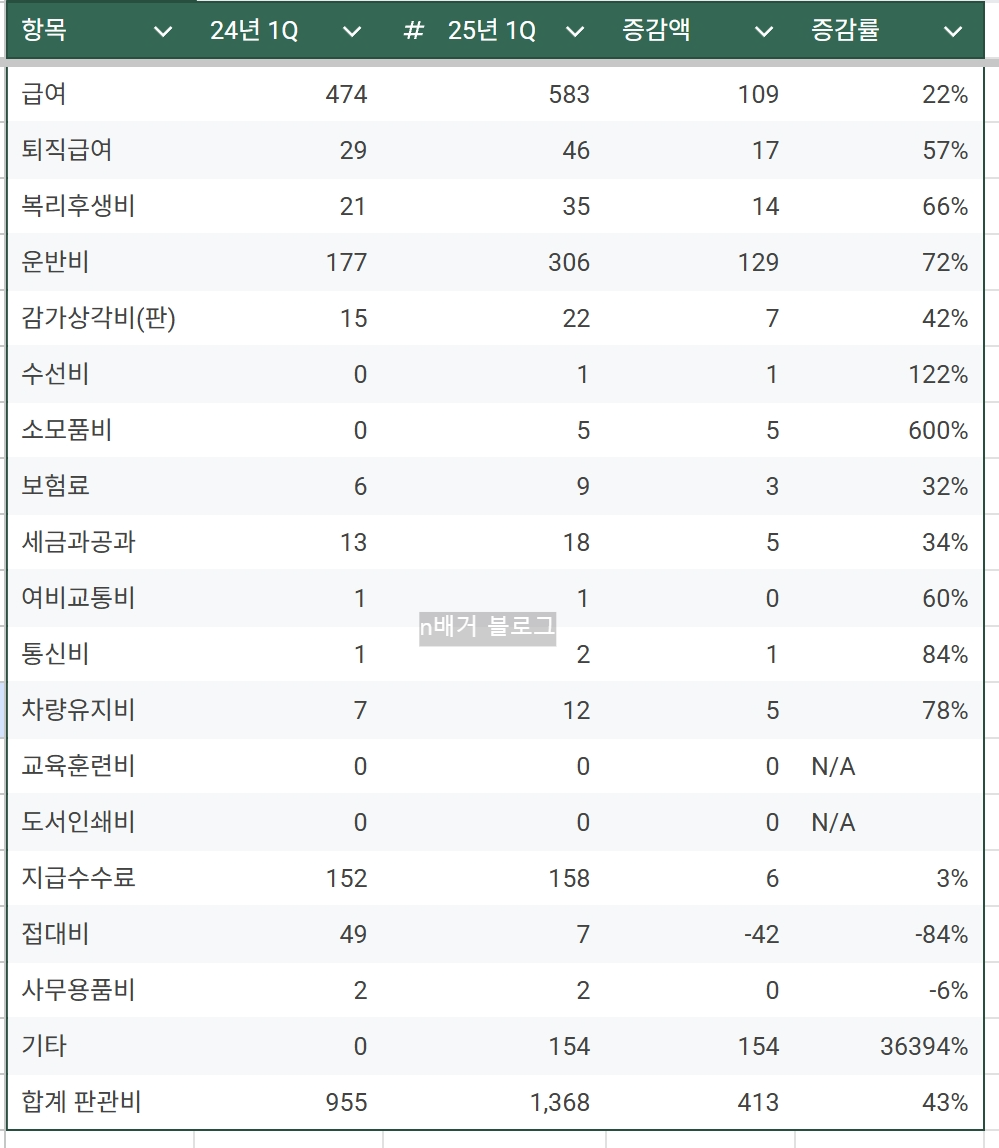 - 급여증가 1억 원 : 24년 1Q 59명 -> 251Q 82명으로 23명이나 직원이 증가