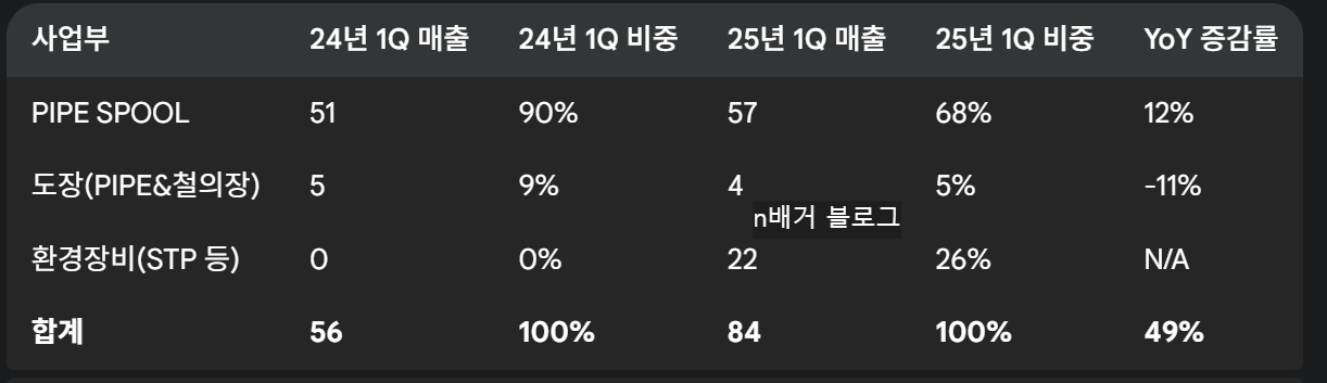 - 특이점은, 환경장비 (STP)가 24년 1Q에는 매출이 없었는데, 신규 사업부문으로 보인다. 사업 다각화는 긍정적