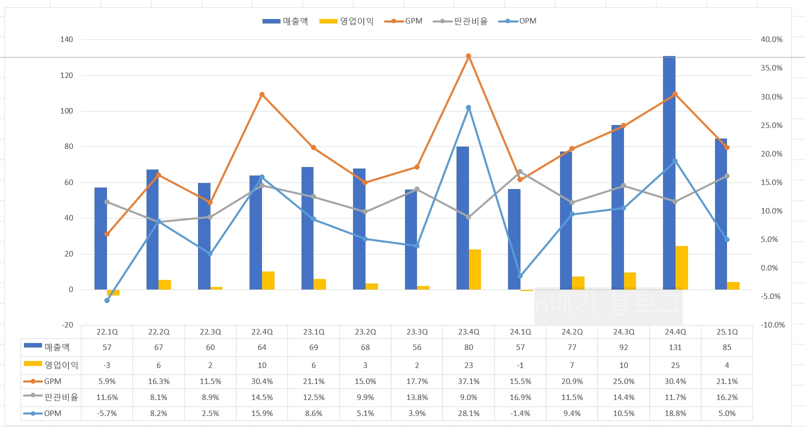 25.1Q의 매출액이 84억이었으니, 단순이 470억 을 4로 나누었을 때 84억의 매출은 많이 부족한 모습이고
