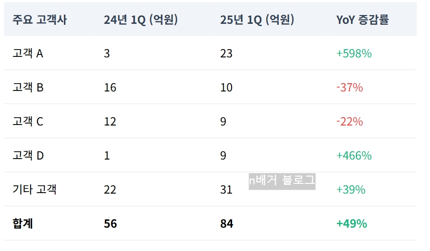 - 주요 고객사 명은 공개되어 있지 않지만, 고객 A 사 와 고객 D 사의 매출 비중이 급격히 증가했음을 확인할 수 있다.