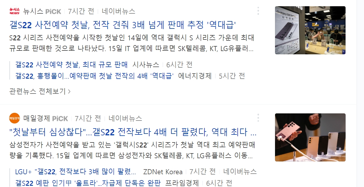 간단히 며칠전 갤22 출시 후 며칠만에 뜬 뉴스들을 봐보자. 물론 마케팅 이겠지만, 안팔린걸 팔렸다고 뻥치진 않겠지.