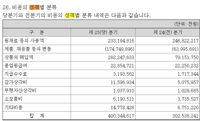 매출원가의 급증은, 상품의 매입액이 큰 영향이었으며, 그외 감가상각비의 증가는 있었지만 판매를 위한 상품의 매입액