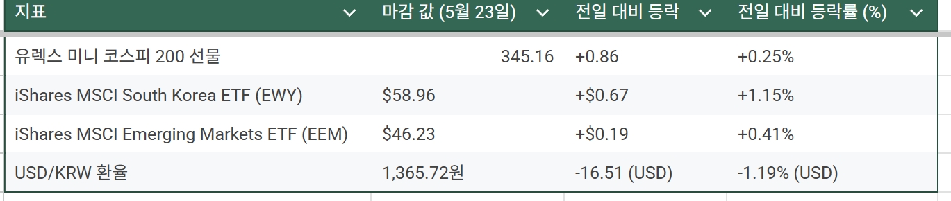 - 원달러 환율의 하락과 EWY 및 코스피 200 야간선물 등은 모두 양봉으로 5월 26일 한국 주식을 바라보는 외인들은 긍정적인 것을 볼 수 있다.