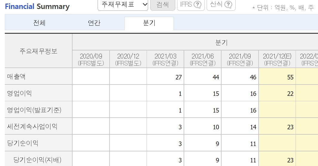 21년 사업연도 기준 실적으론 YoY 매출액 51% 신장, 영업이익 Yoy 58% 신장하였으며, 순이익 또한 흑자전환에 성공을 하였다.