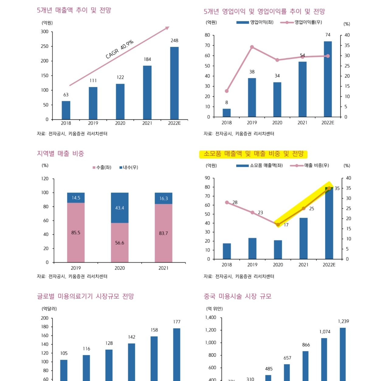 오늘자로 비올 키움증권에서 리폿이 발행되었다. K-뷰티의 섹터에서 장비/소모품주로 루트로닉 과 비올을 그리고 티앤엘 을 좋게 보는데, 우선 비올의 오늘 리폿을 보면, 수출비중 80% 이상기업. 21년 하반기에만 200여대의 장비를 보급하였고, 이로 인해 이미 고마진 소모품 매출의 비중 확대로 OPM이 성장되었고.