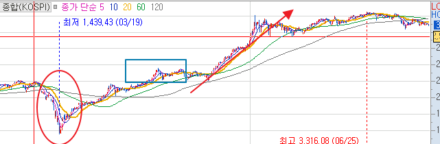 작년 생각만 해도 소름이 끼치는 Covid-19로 인한 계좌 반토막. 정말 절망적이었다. 20년3월 바닥을 치고 급반등 하는 지수였으나, 나는 긍정론자의 소리보단, 부정론 과 공포에 휩쌓여 더블딥 이 올것이라는 확인으로 곱버스 ETF를 일정금액 매수 하였고. 고스란히 날렸다. (빨강 원의 하락을 경험하고, 파랑 사각형 즈음에 곱버스에 투기를 하고, 지수는 하염없이 빨간 화살표와 같이 올라 내 돈은 사라지고..)
