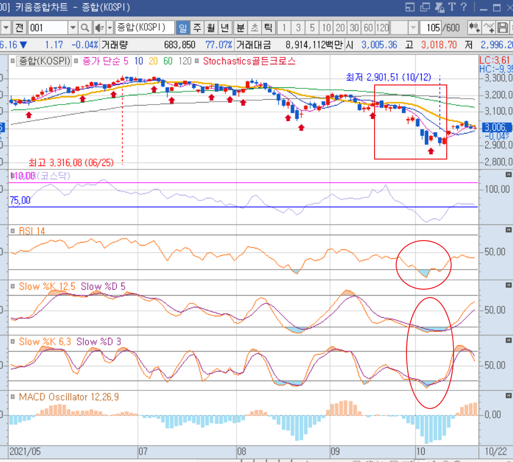 아래 사진은 실제로 내가 지수차트에 적용하여 보고 있는 보조지표 들이며, 9월 말부터 10월 첫주 주구장창 장이 빠질때를 보면, 아래사진에서 RSI 와 Stochastic slow 등이 모두 과매도 구간으로 진입하고 다시 반등 하는 모습을 볼수 있다.