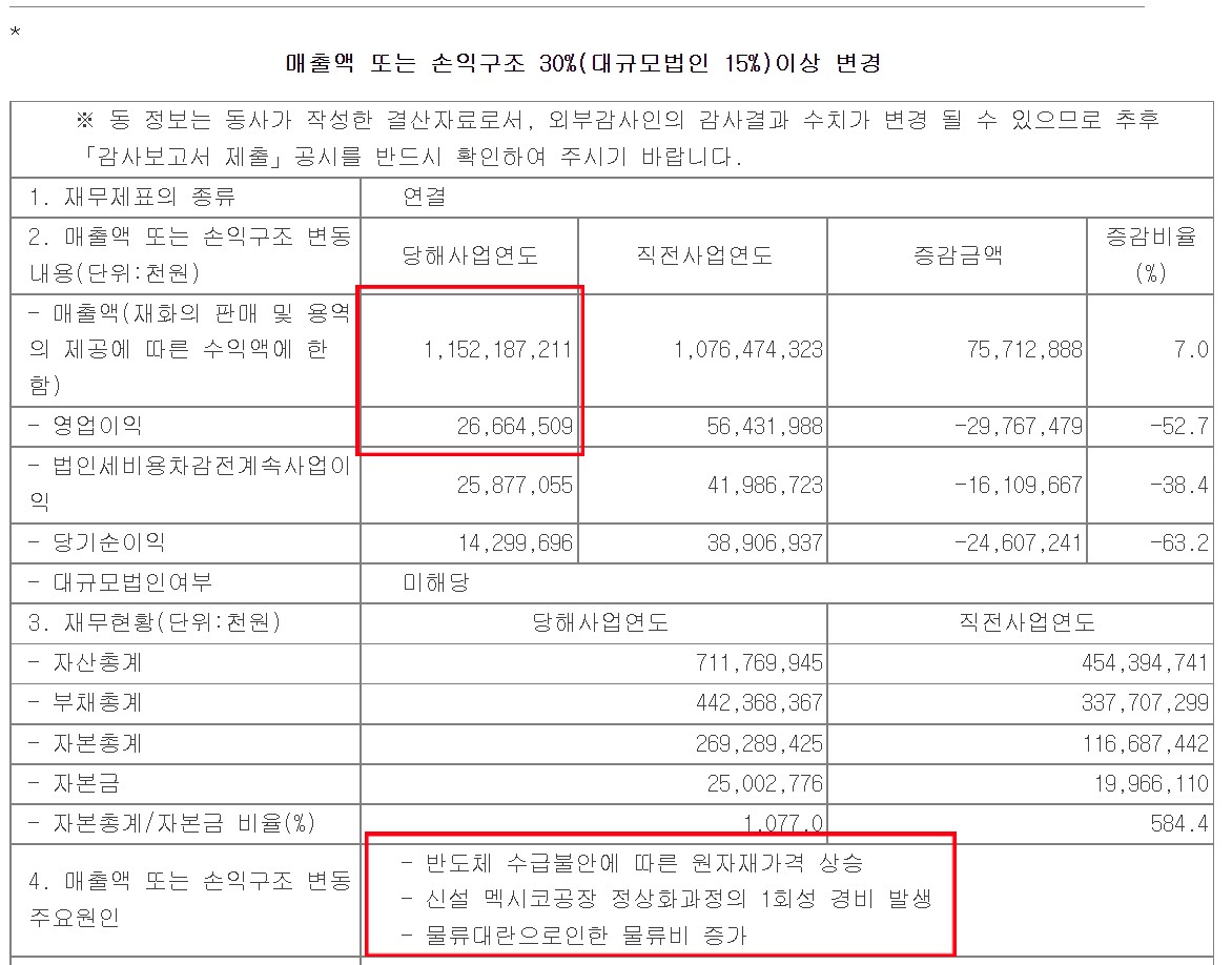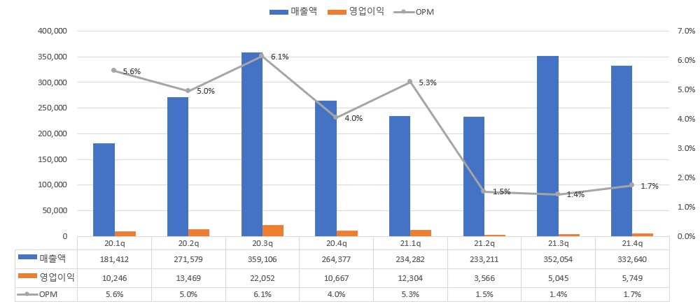 영업이익이 저조한 이유로는, 반도체 수급불안으로 인한 원자재 가격상승 과 물류 병목현상으로 인한 비용 증가.