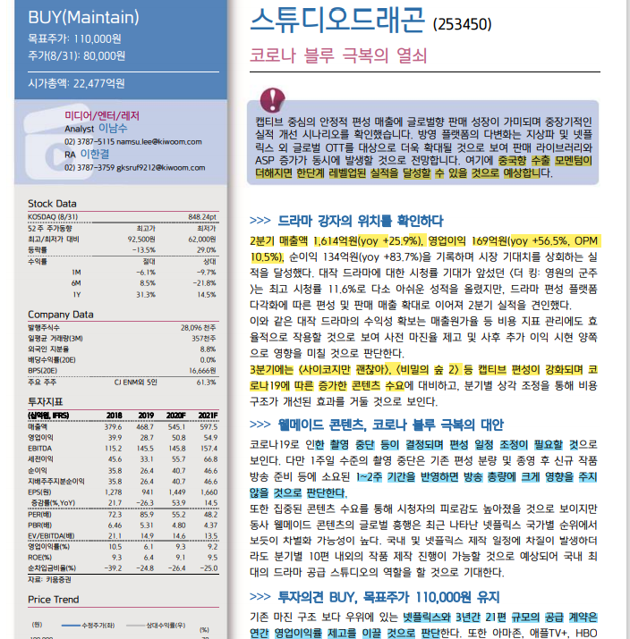 이런주식을 참 좋아 한다. 성장 하면서 확장성을 함께 보유한 너란 스튜디오드래곤 찜콩 했다!