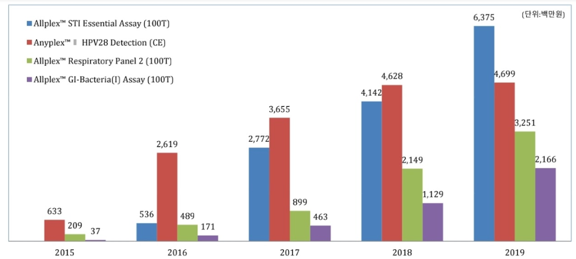 의학쪽은 전혀 모르지만 들어만 봐도 고부가 가치 창출 가능한 산업임에는 틀림 없어 보인다. 씨젠 이라는 회사에서 만드는 진단키트 제품들의 매출 추이를 아래사진에서 봐도 참 그냥 꾸준히 우상향 되고 있는 모습을 볼 수 있다.