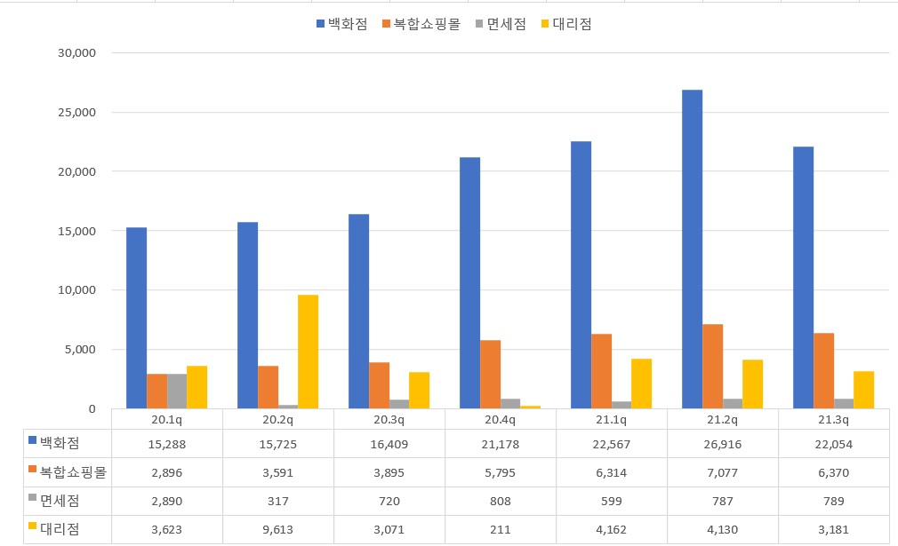 면세점은 코로나 발발 이후로 계속 줄여 나갔고. 잘했네. 백화점을 지속적으로 늘려나가고 있다. 복합쇼핑몰 또한 소폭 증가세.
