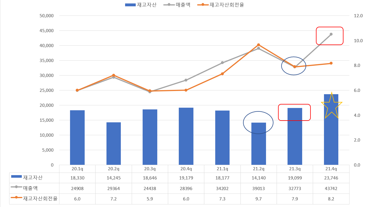 이것은 즉, 22.1Q의 호실적 매출을 예측할 수 있으며, 재고자산 회전율 또한 양호하게 유지 하고 있기에 큰 변수가