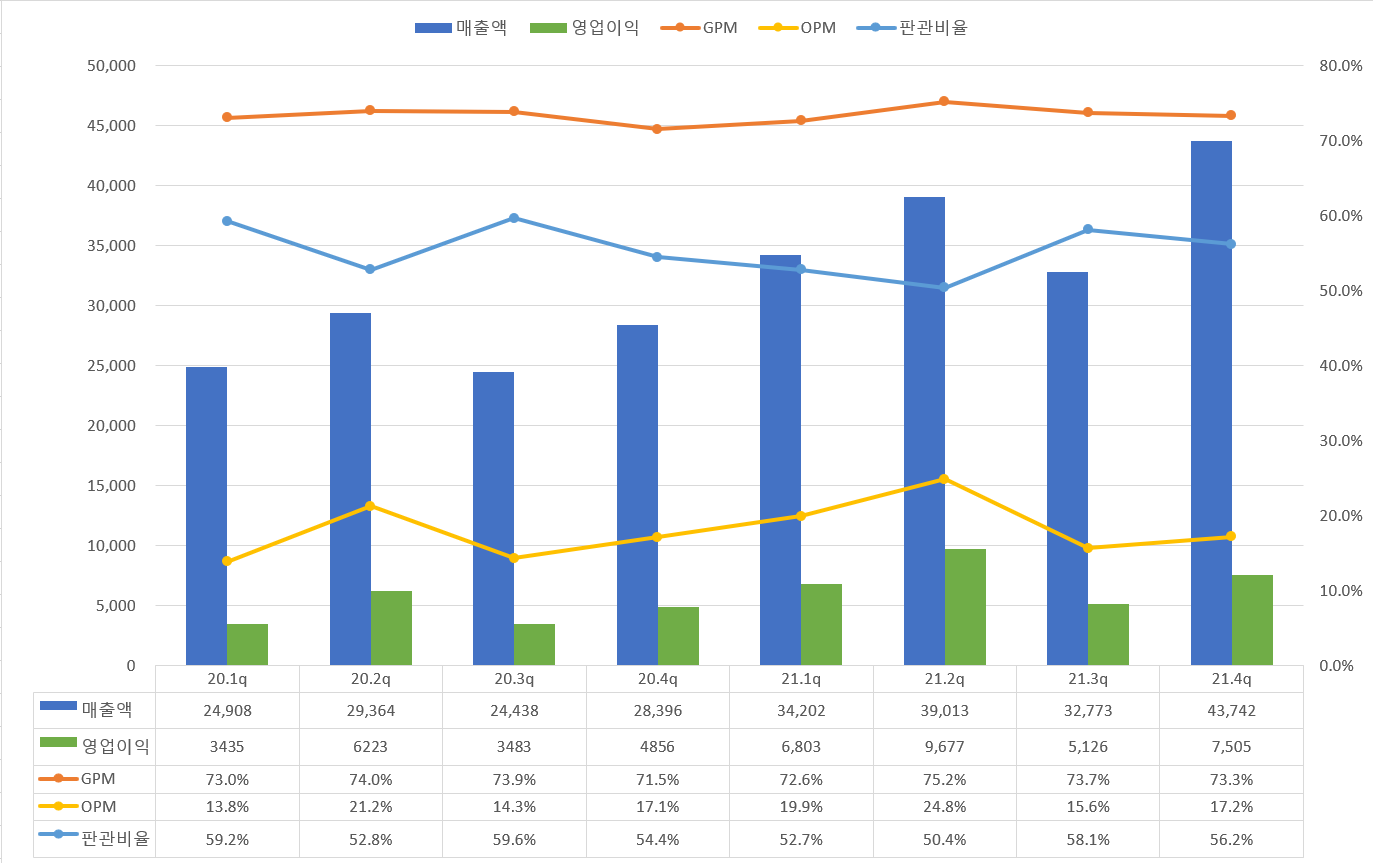 21.4Q 역대급 매출액을 달성했다. 2Q의 OPM인 24% 까지 회복을 하진 못했지만, 그래도 17% 수준의 영업이익률을 보여주고 있으며, 판관비도 소폭 하향 안정세를 찾아 가고 있음을 보여준다.