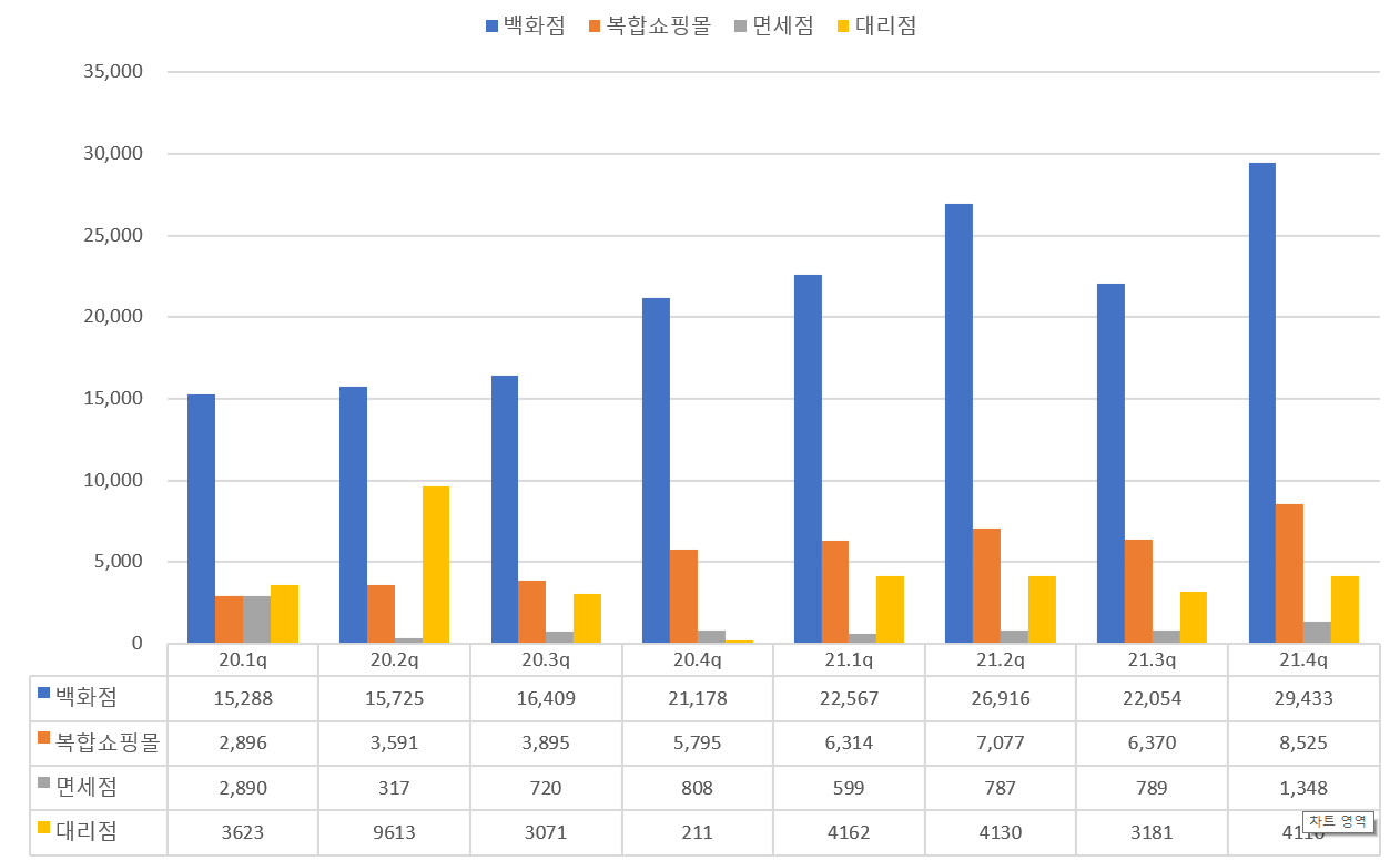 백화점의 매출 증가율이 눈에 띄며, 가장 의미 있는 성장은 면세점의 성장 아닐까 싶다. 위드코로나 로 이제 해외여행이 자유로워 지고 있는 초기 단계인것을 여실히 보여주는 결과물 아닐까?