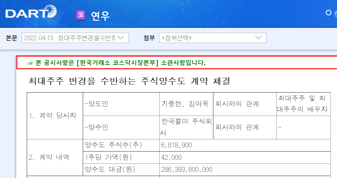 매수고 22,000원 에, 한국콜마 인수가 42,000원. 괴리율 80% 이상.