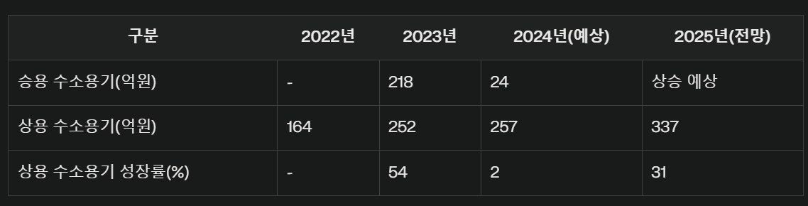 상용차 부문에서는 수소버스를 중심으로 수주가 증가하고 있고, 국내수소버스 시장은 21년 180대, 22년 340대, 24년 1720대로 매년 크게 증가하고 있다. 이에 대응하여 24년 6월 완료 예정으로 전북 완주군에 수소상용차용 연료저장 시스템 제조공장 증설에 총 86억 9천만원을 투자할 계획을 발표한바 있다.