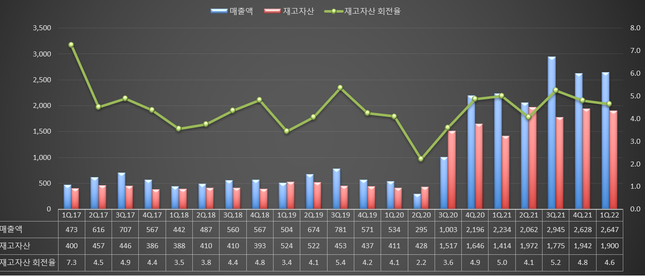 거기에 매출액도 양호한 모습이기에, 2분기를 넘어 3분기로 갈수록 더 실적이 좋아 지지 않을까? 재고자산은 그를 준비 하듯 1900억 정도의 모습으로 유지 하고 있다.