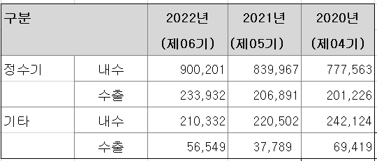 정수기 판매 매출액은 전분기 대비 소폭 상승 하였으며, 렌탈 사업 또한 정상 괘도로 올라가고 있는 것으로 보임.