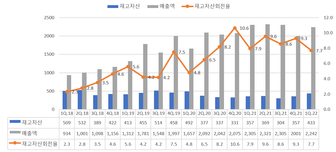 재고자산은 3분기 연속 소폭씩 상승하고 있지만, 매출액 또한 평균의 매출액 정도 나와 주었기 때문에 양호 하다고 판단