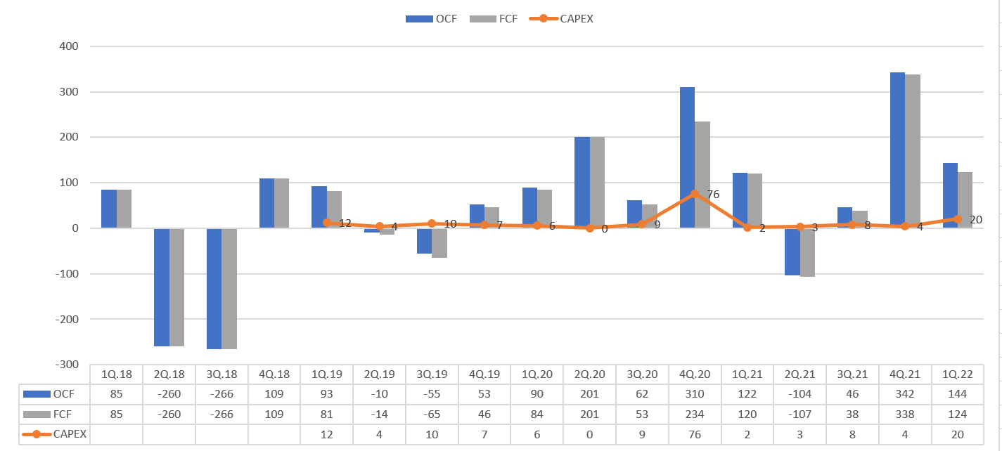 OCF 와 FCF 또한 양수를 유지 하는모습, 저번분기 에 비해선 하락을 많이 하였지만, 그래도 매출채권 은 늘었으나,
