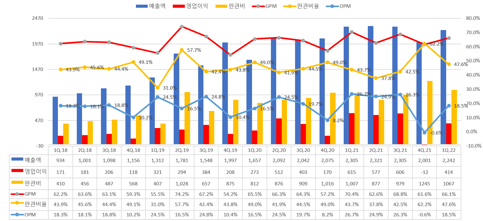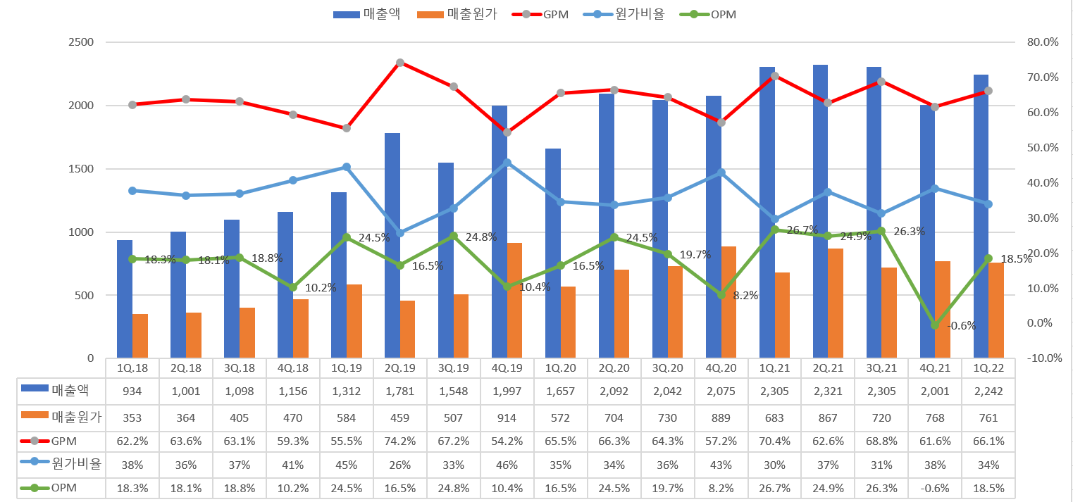 최근 3년간 추세를 보면, 2Q가 1Q보다는 매출 실적이 좋았던 것을 감안하여, 이번 2Q22 에 매출 / 영업이익이 어떻게 되는지 예의주시 해볼 만 할거 같다.
