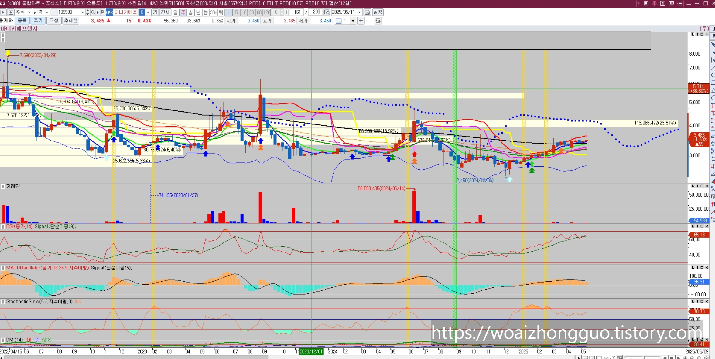수년간 시속적인 하락을 보이며, 장기 이평을 뚫으며 주가 상승의 시도도 했지만 번번히 다시 장기 이평을 깨고 하락을 하며