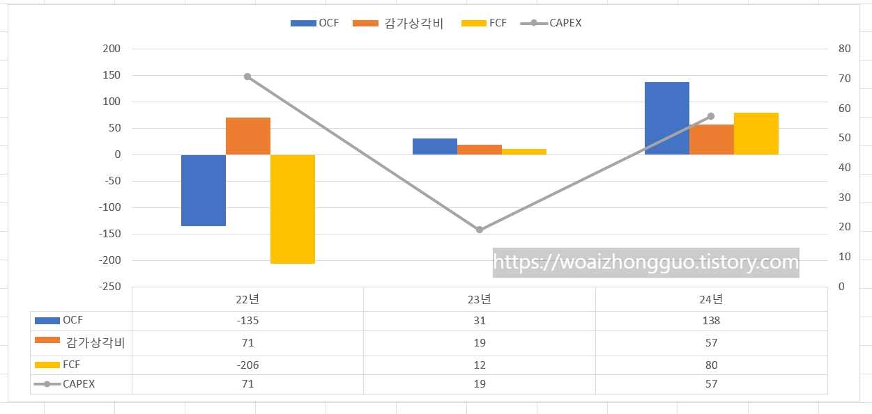Capex 의 증가, 판관비 증가에도 불가하고, OCF의 막대한 증가에 의해 FCF도 11억에서 80억으로 큰 개선을 보여줌.