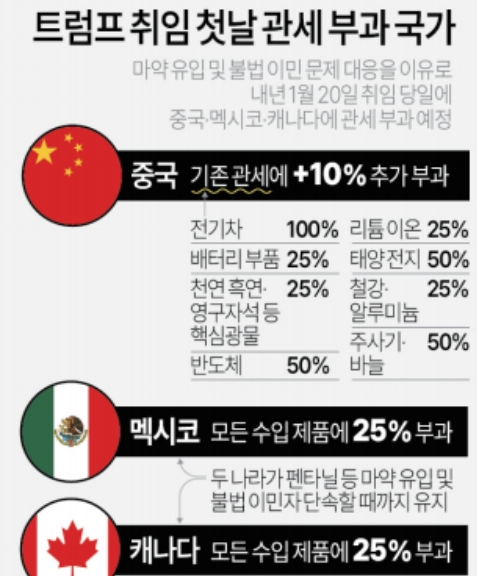 이는 기존에 부과되던 관세에서 추가되는 것으로 트럼프대통령이 재집 관후 첫 번째로 시행한 관세 정책이다.