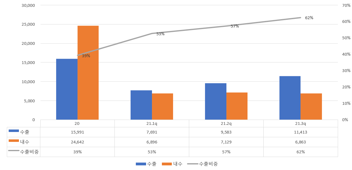 20년까지만 해도 티앤엘 기업의 매출비중의 60%가 내수였고, 수출이 40% 였다. 하지만 21년1q 부터 점차 수출의 비중이 커지면서 3q 에서는 60%를 넘는 모습을 보이고 있다.