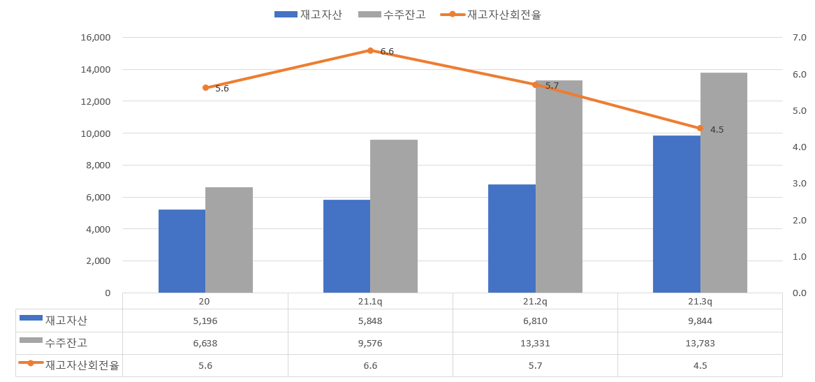 분석을 하며 우려가 되었던 점인데, 티앤엘 의 재고자산이 지속 늘어 나고 있다. 이에 따른 재고자산회전율 은 하락하는 모습이다. 보통 수주잔고가 늘지 않으며 재고자산만 늘었다면 티앤엘 주가전망에 안좋은 영향을 끼쳤겠으나,