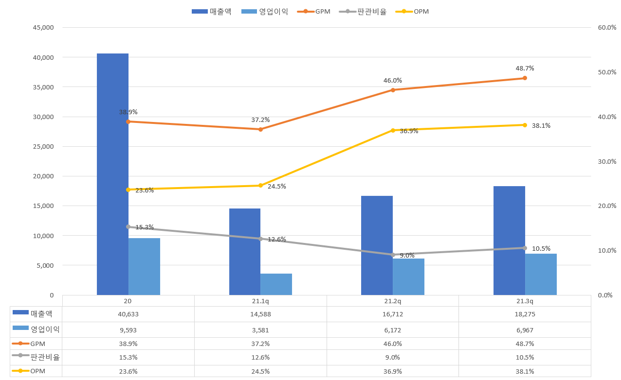 (Note : 20년은 분기별 자료가 없음. 위 차트에서 20년의 총합 수치이며, OPM / GPM의 변동성을 보기 위해 넣었다)