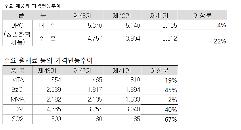 전체 매출금액에서, 수출이 차지 하는 부분이 약 20% 밖에 되지 않는 점을 감안하면, 아래 주요제품의 가격변동에서,