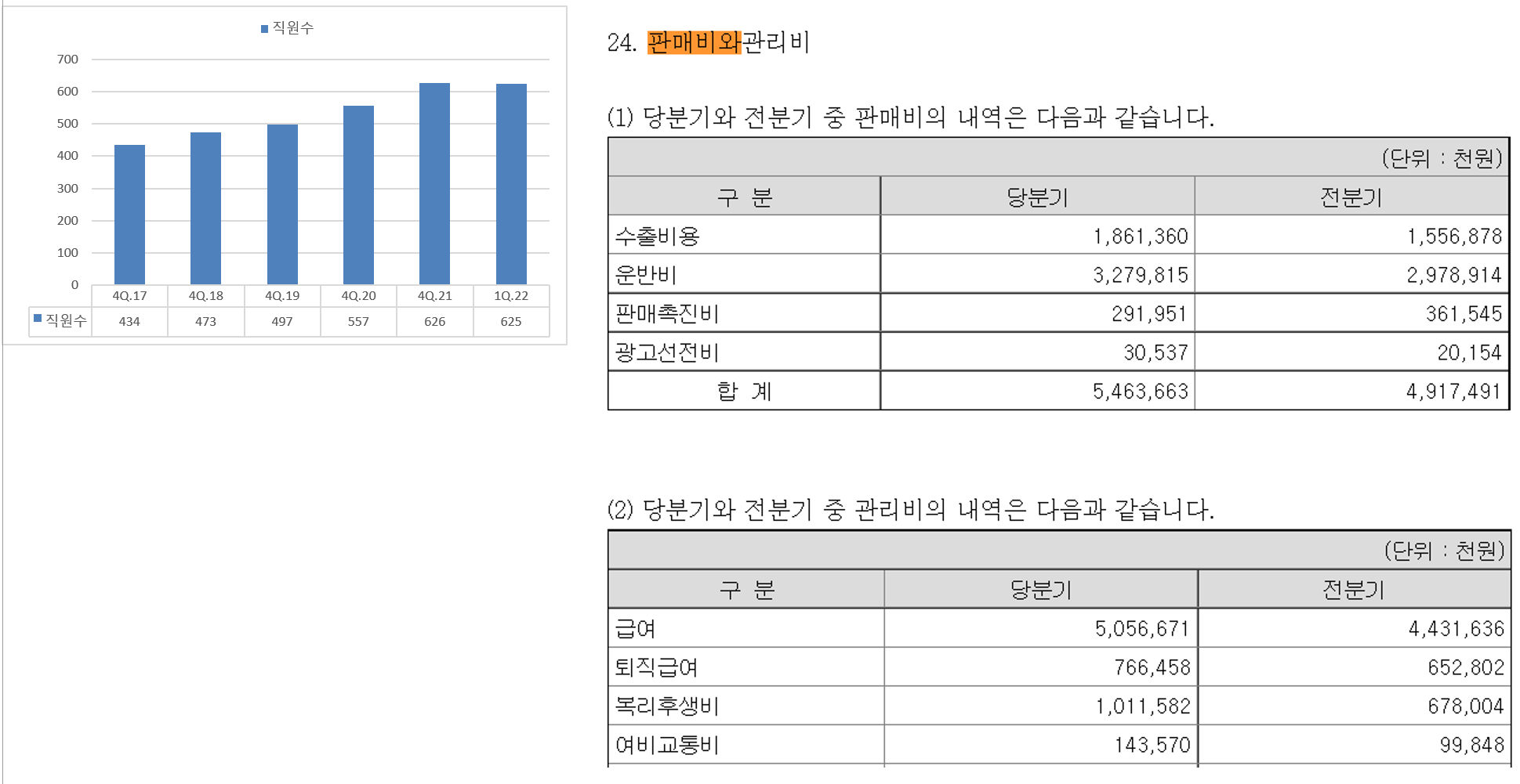 특이점이라면, 직원수는 작년 4Q21 에 626명이었으며, 금회 1Q22 에는 되려 1명이 줄었음에도