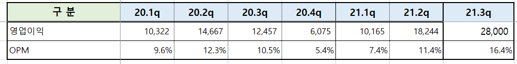 21.3Q 잠정 실적을 보면 매출액 1,709억원(YoY: +43.66%), 영업이익: 280억원(YoY: +124.9%) 으로 역대 최고 실적을 보여주었으며, 영업이익률이 역대 최고인 16% 를 넘어 섰음을 아래 표에서 볼 수 있습니다.
