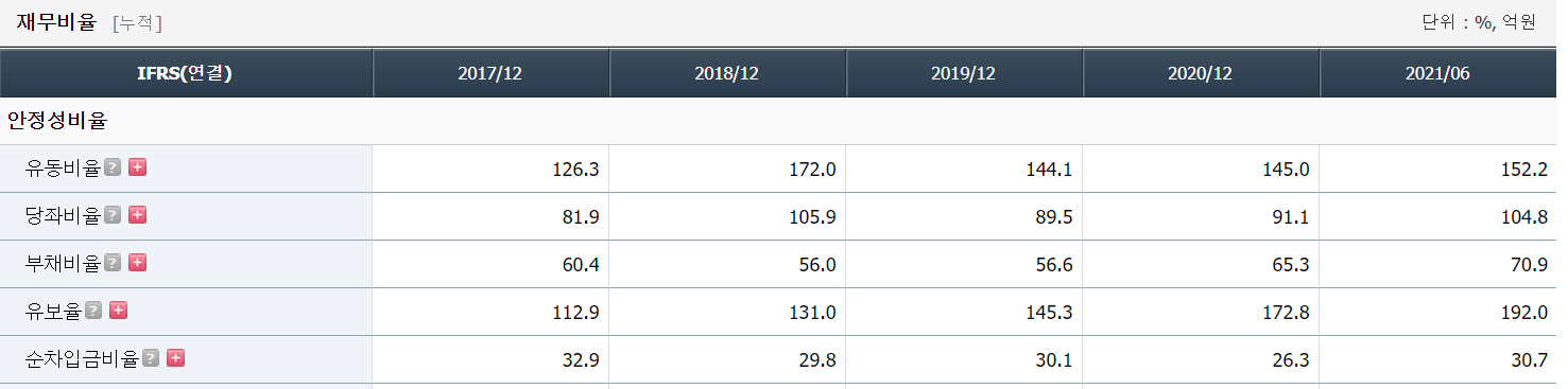 유동비율이 100% 이상이며, 부채비율은 70.9% 로 아주 양호해 보인다.