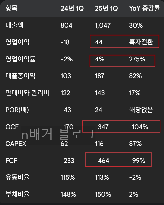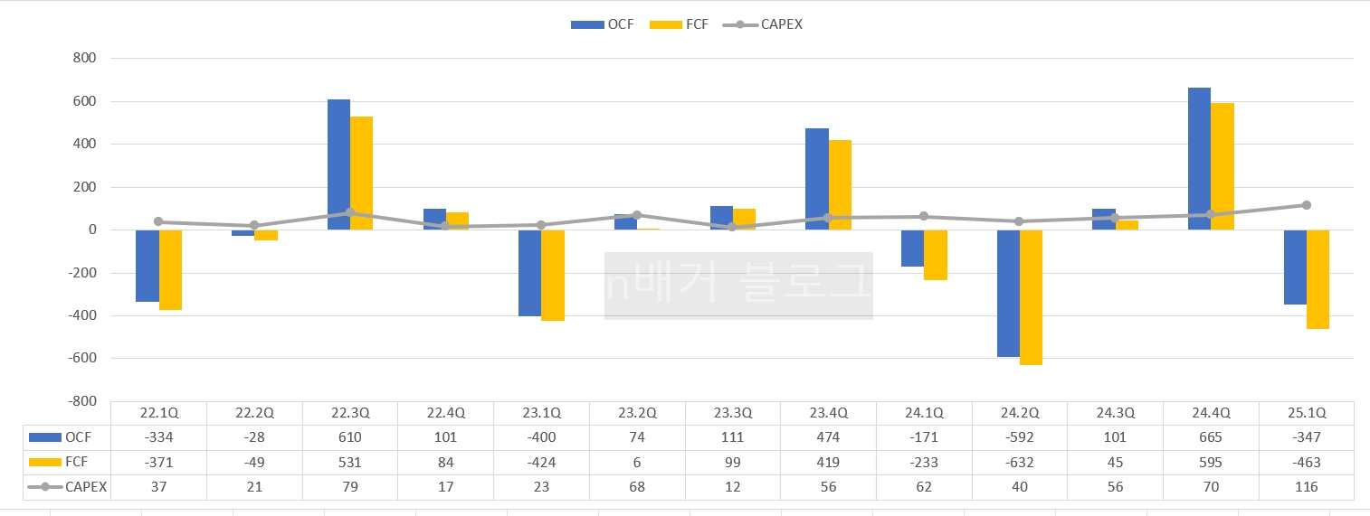 - 현금흐름의 악화 : OCF -347억 적자폭 확대 / FCF -464억 적자폭 확대.