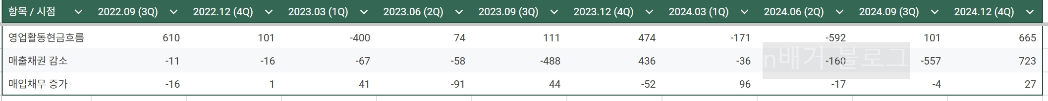 위 표를 보면, 23년 4분기에 436 억의 매출채권이 감소 , 24년 4Q에는 723억 감소하며 현금 유입이 많이 되었었다.