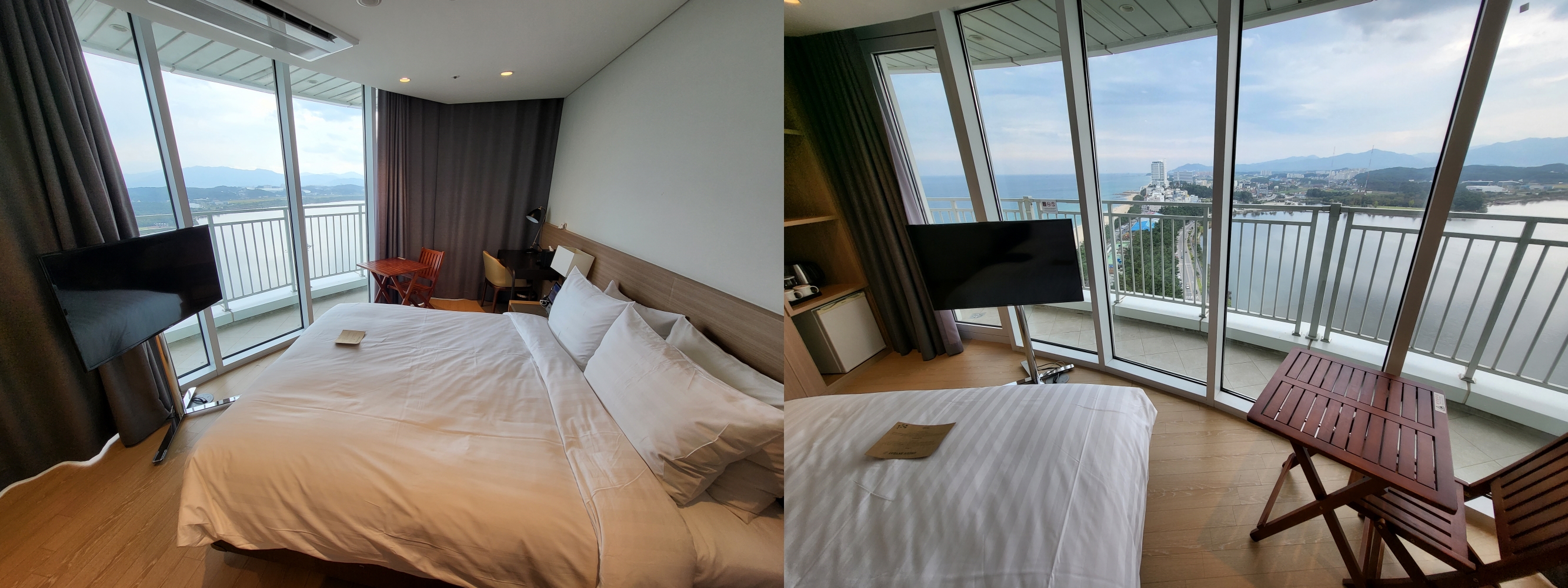 스카이베이호텔경포 끝쪽 코너 방의 장점은 호수뷰 와 바다뷰를 동시에 만끽 할 수 있다는 점이다. 단점은 좀 비좁다. 확실이 코너 부분 을 쪼개서 쓰는 듯한 느낌이 있다.