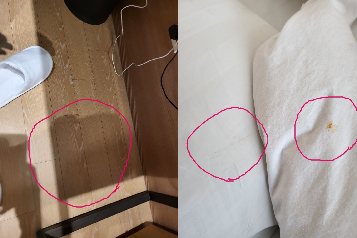 다음날 아침에 일어나서 샤워하고 뒤척여져 있던 이불을 보니.... 오염물질 그대로였다. 아 진짜 너무 화가 났다.