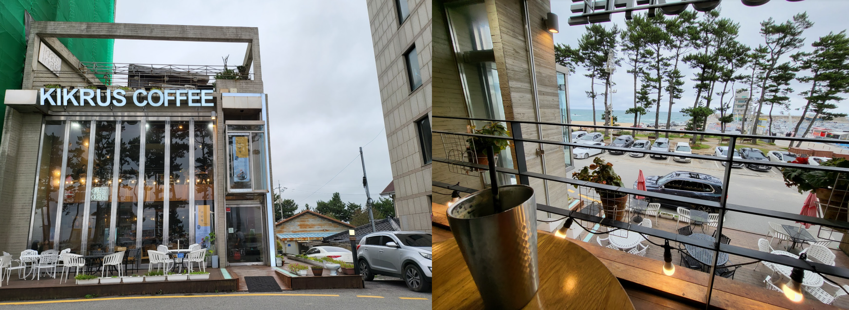 개인적으로 강릉 안목 카페 에서 가장 맘에 들었던 카페는 KIKRUS COFFEE 였다. 차로 이동시 입구에서 거의 끝~ 자락에 위치해 있다. 사람마다 취향이 다르지만 갠적으로 입구 초입에 있는 카페들 보다 사람이 덜붐볐으며 통유리 로 되어 있는 문을 개방 해놓아서 정말 시원하고 좋았다.