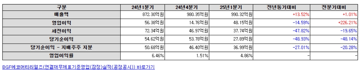 - 영업이익은 you -14.59% 감소하여서 실망. 영업이익률도 6.46% -> 4.86% 로 하락. 즉 24년4Q의 수익성 훼손이 아직 이어지고 있음을 예측 가능.