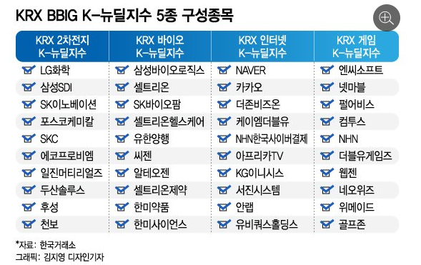 위 사진은 KRX BBIG K-뉴딜지수 5종 섹터의 구성 종목 List 이다. 사야할게 넘 많다. 좋은 놈도 넘 많다