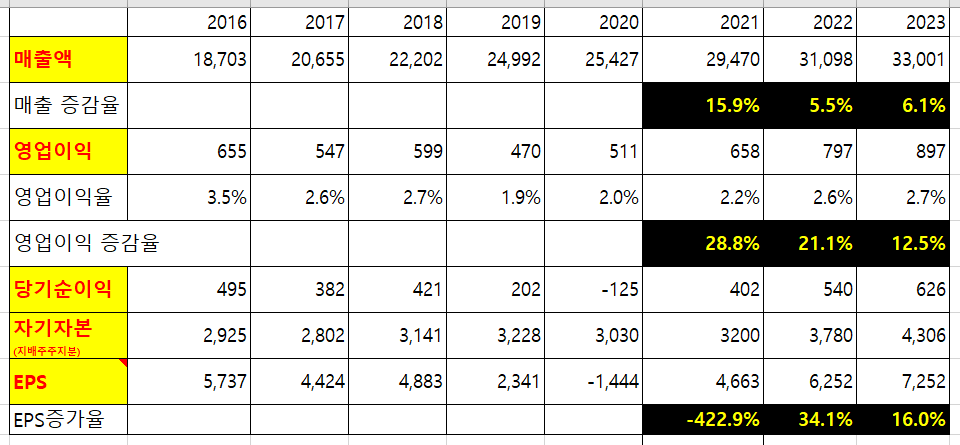 2022년에도 성장한다. 오늘 주가는 21년분 에 대해서 적정주가 반영 했다 치고. 22년에 그리고 23년까지 컨센 매출액과 영업이익을 끌어내 줄 수 있다면? 22년 예상 EPS가 6250원 이다. 원재료 가격 인하까지 된다면 더 높아질 것이고